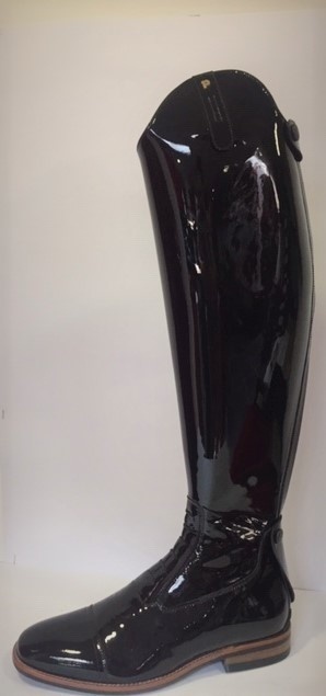 Dieser Petrie Aachen ist in schwarzem Lackleder mit farbiger Sohle erhältlich. Es handelt sich um einen Allzweckstiefel mit Schnürung, einem Reißverschluss an der Wadenrückseite und einer Schutzkante, die das An- und Ausziehen erleichtert. Es handelt sich um einen flexiblen Stiefel mit einer sehr engen Passform. Der Schaft mit seinem Futter aus Kalbsleder bietet hervorragenden Halt und ausgezeichneten Kontakt zum Pferd. Es gibt einen zusätzlichen Reißverschlussschutz und der speziell für Sporen entwickelte Fersenschutz schützt auch den Reißverschluss.