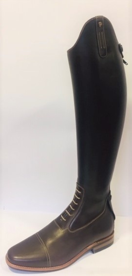 Dieser Petrie Aachen ist in dunkelbraunem Kalbsleder erhältlich. Es handelt sich um einen Schnürstiefel für alle Zwecke mit einem Reißverschluss an der Wadenrückseite und einer Schutzkante, die das An- und Ausziehen erleichtert. Es ist ein flexibler Stiefel mit einer sehr engen Passform. Der Schaft mit seinem Futter aus Kalbsleder bietet hervorragenden Halt und ausgezeichneten Kontakt zum Pferd. Es gibt einen zusätzlichen Reißverschlussschutz und der speziell für Sporen entwickelte Fersenschutz schützt auch den Reißverschluss.