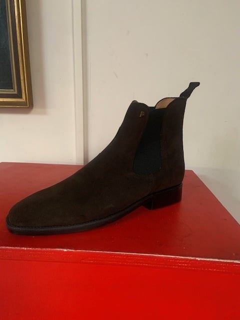 The Petrie Oslo ankle boot is made of suede leather with a soft calfskin lining and an black coloured elastic instep. The soft comfort sole and shaft makes this boot ideal for walking and hiking.   Available in brown UK size 10.5 (US 11.0)