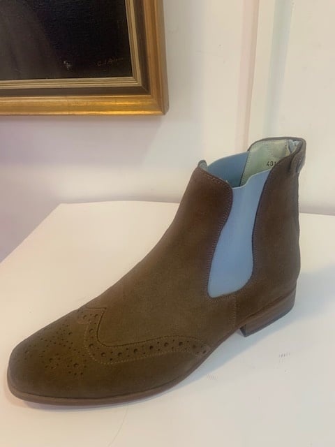 The Petrie Oslo ankle boot is made of brown suede leather with a soft calfskin lining and an blue coloured elastic instep. The soft comfort sole and shaft makes this boot ideal for walking and hiking. Available in brown EU size 40