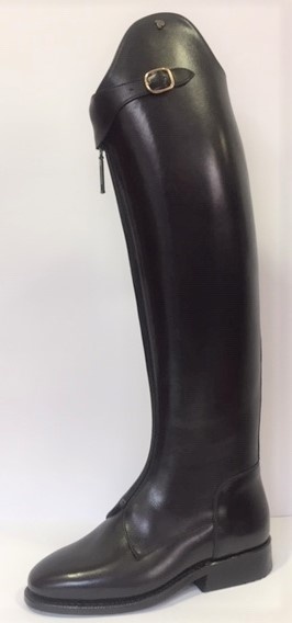 Dieser Polo Pro P301 ist aus schwarzem Kalbsleder in UK-Größe 2,0 (US-Größe 4,5) mit einer Schafthöhe von 43 cm hinten (ohne Ferse) und 47 cm außen und einer Wadenweite von 34 cm, Serie 5 XLW, gefertigt.