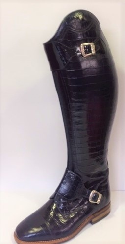 Der neue Polo Rome ist ein Allzweck-Polo- und Trainingsstiefel mit einem Reißverschluss vorne für einfaches Anziehen und einer unteren Fersenverstärkung. Ein Reißverschlussschutz oben mit einer Schnalle mit Strasssteinen und ein Schutz über der Ferse mit derselben Strassschnalle. Der Schaft ist an der Außenseite extra steif. Dies verringert den Druck auf den Knöchel des Reiters und sorgt für maximalen Komfort. Der Stiefelschaft ist außergewöhnlich elegant und liegt eng am Knöchel an. Der Polo Pro hat ein durchgehendes Innenfutter aus Kalbsleder. Die Ago-geklebte Sohle hat ein rutschfestes Profil und ist extrem strapazierfähig. Erhältlich Polo Rome P307 in schwarzem Krokodilprint UK 3,5 (US-Größe 5,0) Schafthöhe 45 cm (hinten, ohne Ferse), Außenlänge 51 cm, Wadenumfang 38,5 cm und Kniebeugung 35 cm. Maßgefertigt