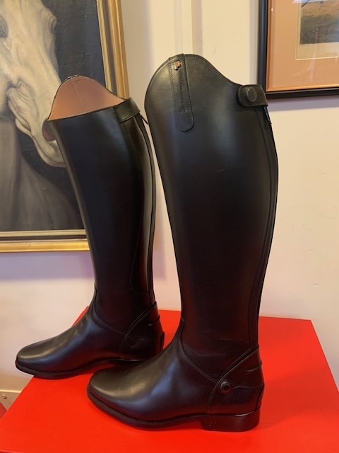 Dieser Leeds Z002 ist aus schwarzem Rindleder in der Schuhgröße 6,5 (US-Größe 8,5) mit einer Schafthöhe von 44 cm an der Rückseite (ohne Absatz) und einem Wadenumfang von 37,0 cm erhältlich.