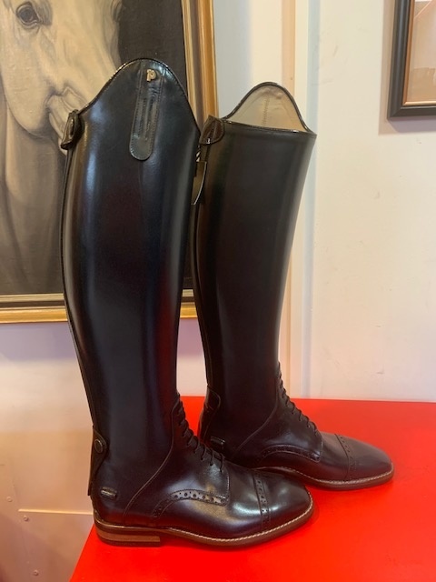 The Petrie Coventry is a lace-up Jumping boot with a rear zipper down the calf and a protective edging making it easy to slip on and off. A very flexible boot with a very tight fit throughout, even around the ankle.The shaft with its calf leather lining gives a great grip and good contact with the horse. There is an extra zipper guard and the heel protector, specially designed for spurs also protects the zipper.
