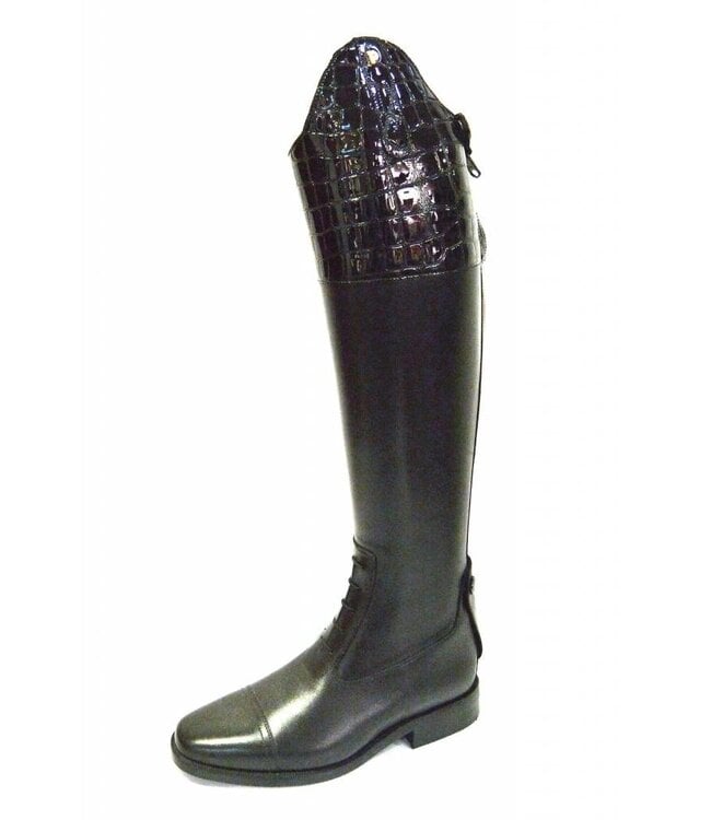 The Coventry J311 is available in black with a black croco hunting top UK size 4.0 (US size 6.5) 46-32 made to measure. The shaft height is 46cm at the back without heel and 50cm at the outside and the calf outline is 32cm.