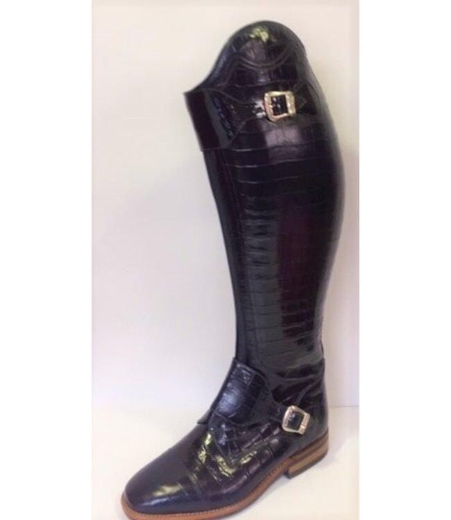 Available Polo Rome P307 in black croco print UK 3.5 ( US size 5.0) shaftheight of 45cm (at the backside, without heel), outside 51cm and a calf outline of 38.5 cm and a crook of knee of 35cm. Custom made.