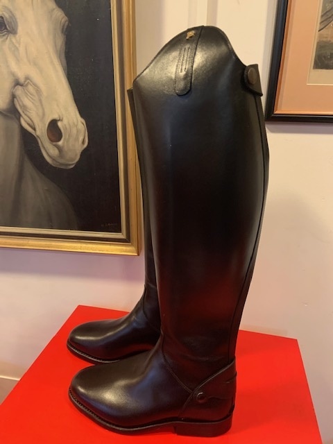 The Leeds is made of smooth soft cow leather with a full calf leather lined bootleg. The Leeds is a very flexible boot, with a very tight fit throughout, even around the ankle. The rear zipper runs down the calf to the sole. It is an all-purpose riding boot. The boot has a heel reinforcer protector for spurs which also protects the zipper. The Leeds has an elegant carré-mold. The demanding rider will find the special comfort footbed and slim ankle fit very useful. The Ago glued sole has a non-slip profile and is extremely durable.