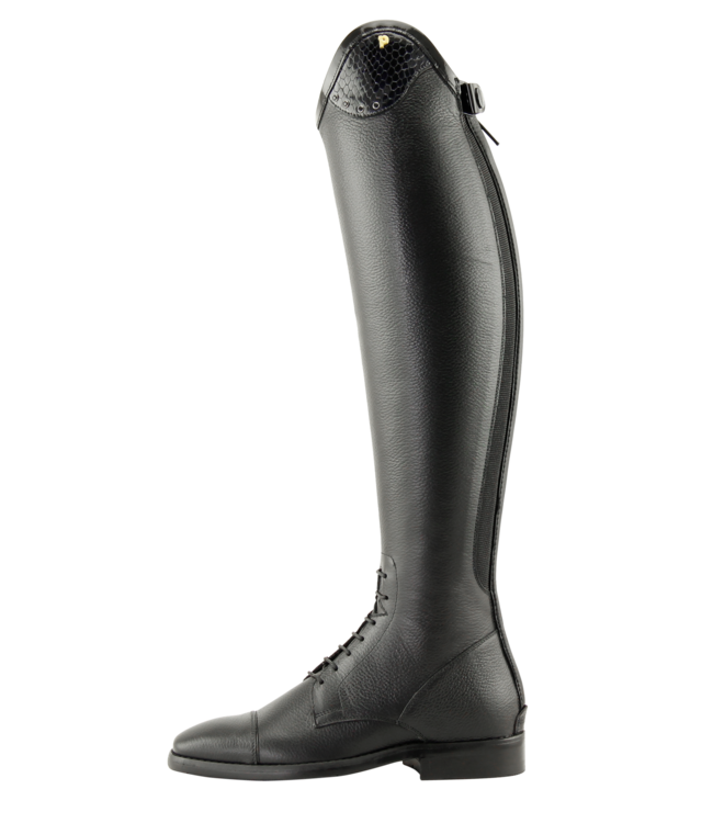Petrie Luca is een zwarte rijlaars met vetersluiting en een honingraatstructuur in zacht nappaleer aan de bovenkant, 5 cm buitenrand. Decoratieve vetersluiting aan de voet. Ritssluiting aan de achterkant met elastiek. Comfortabele voetbedding, Ago-gelijmde rubberen zolen. De Luca-bovenboord is verkrijgbaar in 3 kleuren: zwart, bruin en blauw honingraat met bijpassende lakbies, stiksels en Swarowski-strasssteentjes. Petrie Luca J738-39 is verkrijgbaar in zwart, maat 39, schachthoogte 44 (aan de achterkant van de laars), kuitomtrek 37 cm